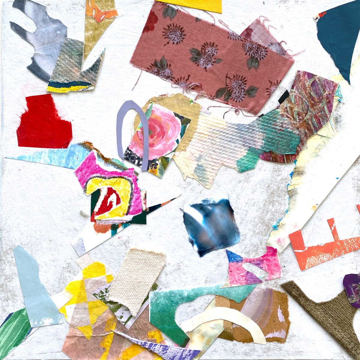“Let Go” by artist Dani Samson is a series of collages created through an intentional act of surrender. Samson states “Using a diverse array of materials, I enlist gravity as my collaborator, dropping cut elements onto a surface and gluing them down exactly where they land. By relinquishing control, I suspend my thoughts and conditioned habits, allowing surprising compositions to emerge. This process yields arrangements that challenge my expectations, often leading to captivating material interactions that bring new depth and complexity to the work. Much like life itself, this series explores the cycle of choice, chance, acceptance, and interpretation. Each viewer brings their own perspective, assigning meaning in the same way I do when stepping back from the work. I invite audiences to spend time with these pieces, asking themselves: What could it be? What could it mean to me?”